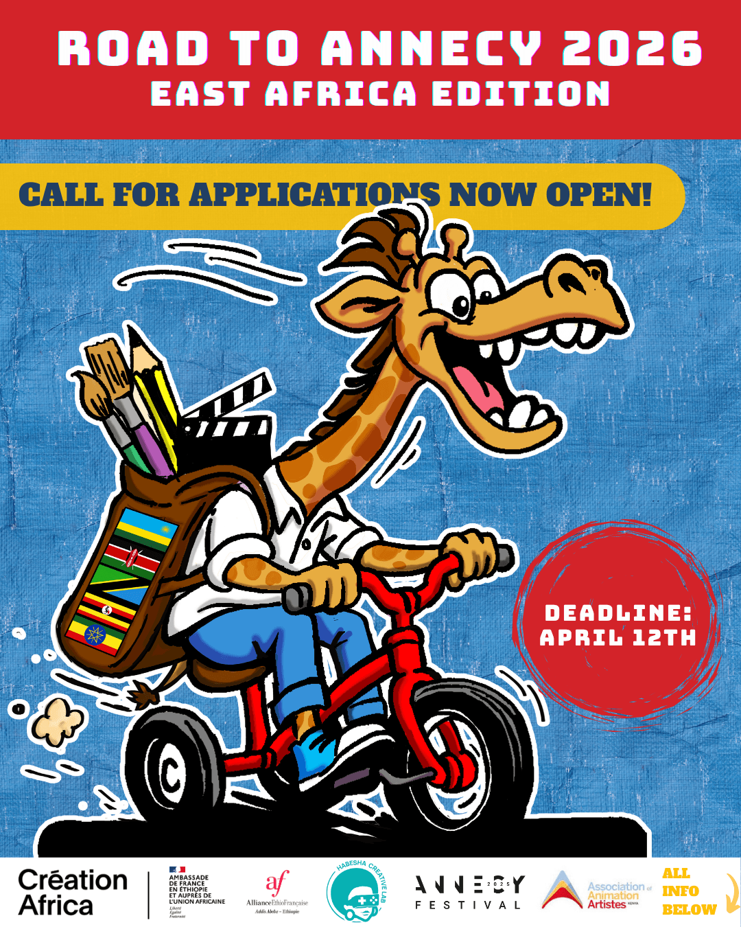 The Road to Annecy 2026 – East Africa edition is a flagship initiative supported by the French Embassy in Kenya and delivered in partnership with Alliance Française Kampala, the Habesha Creative Lab (ETH), Hub @ Alliance (KE), the Association of Animation Artistes Kenya (KE), and MIFA Annecy (FR).